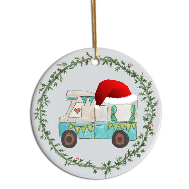 Ceramic Christmas tree decorations featuring my watercolour designs.