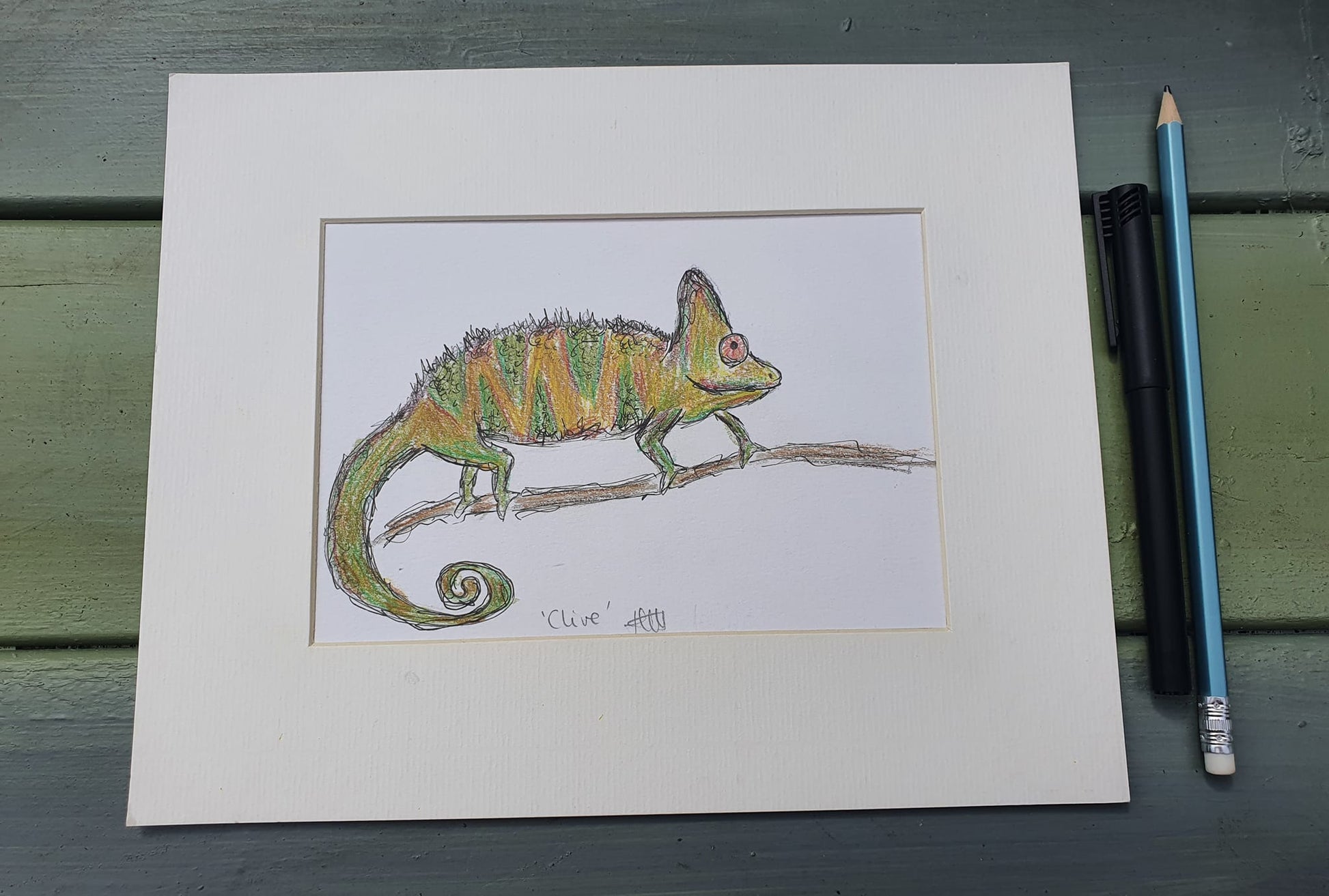 'Clive' chameleon has been created using polychromo pencils and ink