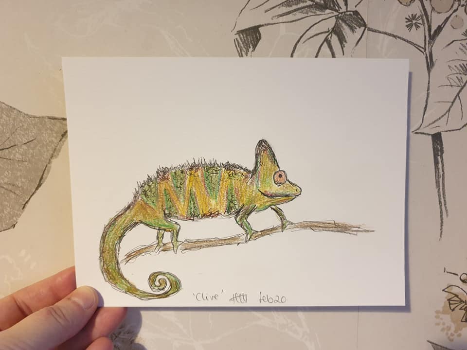 We have a pet chameleon called Clive and they are such characters! I based this drawing on him