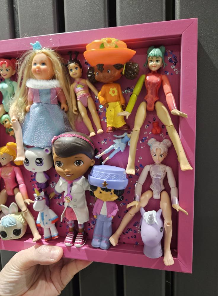 Made using dolls which were heading for landfil. These are so fun for any childs wall and will provide of hours of fun to look at. Each time you look you will see something new. Colourful, fun and original.